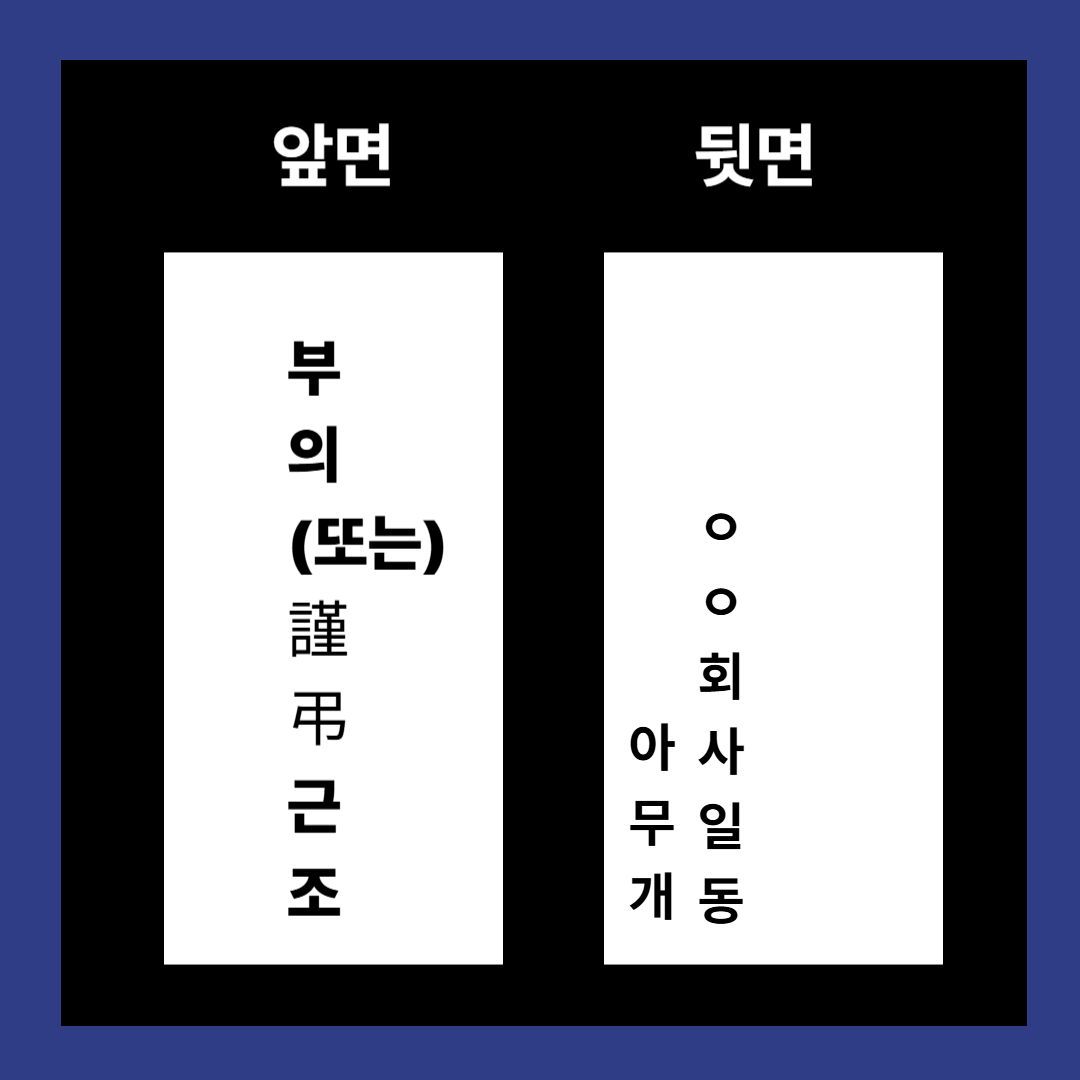 | 구분 | 앞면 문구 | 뒷면(또는 좌측) 이름 표기 |