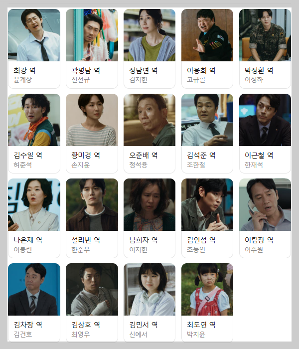 - 곽병남 (진선규): 기술병 출신. 동네 청년회장으로 활동하며 넉살이 좋습니다.